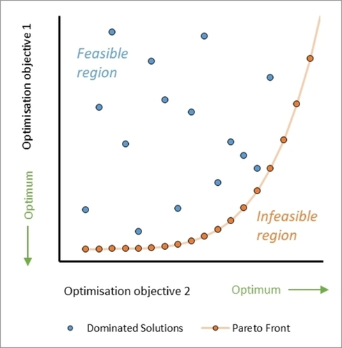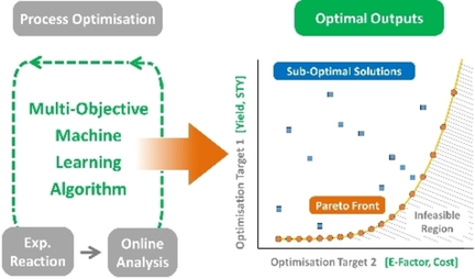 Another key point for multi-objective algorithms is that objectives sometimes compete with one another (e. g. yield vs. cost), which makes it is impossible to find a single set of ‘utopian’ conditions that correspond with optimal values for both objectives. One representation of competing multi-objective optimization is a Pareto front (Figure 2),6 which is a set of non-dominated data points where either objective cannot be improved without having a detrimental effect on the other, i. e. showing the trade-off between objectives. An example of an algorithm for efficient multi-objective reaction optimization is the open-source Thompson Sampling Efficient Multi-Objective (TS-EMO).7 Lapkin and co-workers6810 have demonstrated the quality of the generated Pareto fronts, as well as the algorithm’s efficiency at identifying them, when compared with alternative algorithms such as ParEGO.11 Alternative examples multi-objective algorithms12 developed for chemical process include Phoenics13 and Chimera.14