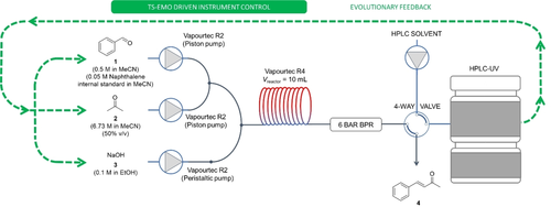The self-optimization system utilized in this work features exclusively commercially available equipment and the TS-EMO multi-objective optimization algorithm (Figure 3). The flow chemistry equipment consists of two Vapourtec R2 modules and a R4 reactor module for controlling solution flows and reactor temperatures respectively. These parameters are controlled from within the software provided by the manufacturer.