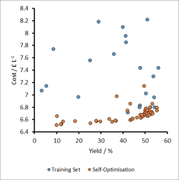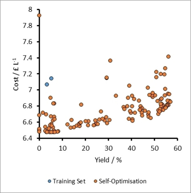 A plot of cost vs yield for experiments related to the self-optimization of aldol condensation reaction in Scheme 1 with limits from Table 1 (Self-Optimization One). The initial training set experiments and self-optimization experiments combine to form a Pareto front and the trade-off between the two optimization targets.