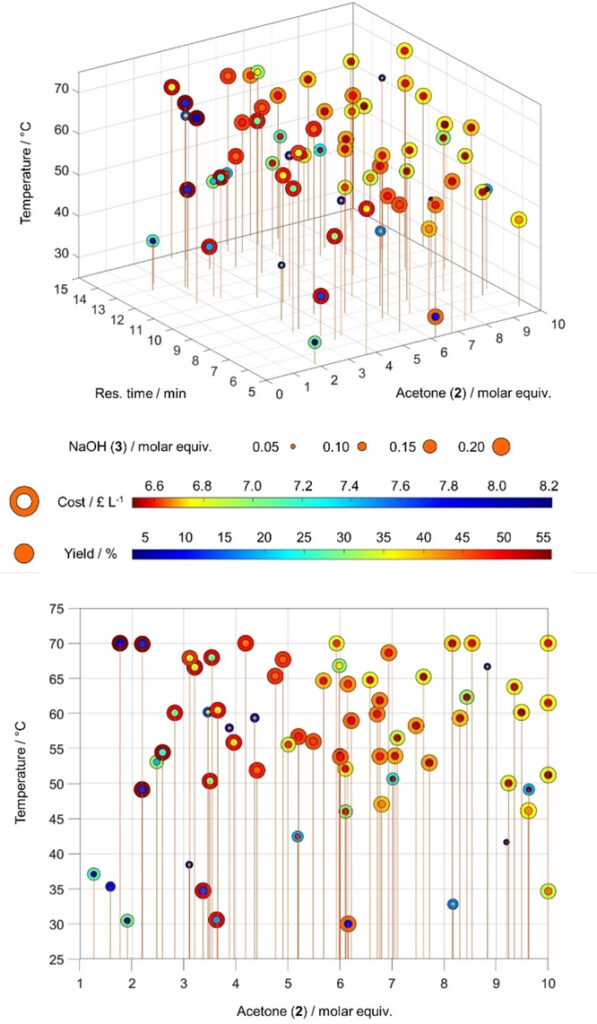 3D (upper) and 2D (lower) plots of experiments run in the Self-Optimization One of the aldol condensation reaction depicted in Scheme 1. Each point represents a single experiment executed during the optimization. The graph displays five variables as follows: (x) molar equivalents of 2, (y) residence time in the heated reactor (z) temperature of reactor. The point size denotes the molar equivalents of 3 in each run. The core color of each point represents the yield (%), whilst the shell color represents the cost of each experiment (£ L−1), as shown in the legend. Lower figure is identical to upper but rotated to depict data as viewed along the y-axis.