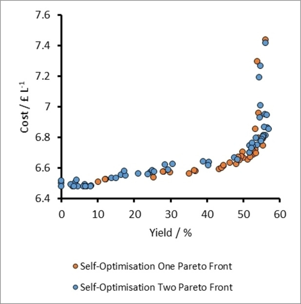 A plot of cost vs yield for experiments related to the self-optimization of aldol condensation reaction in Scheme 1 with limits from Table 1 (Self-Optimization Two). The self-optimization experiments combine to form a Pareto front and the trade-off between the two optimisation targets.