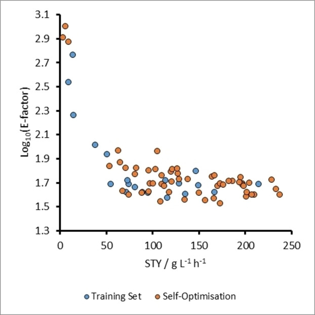 The same initial training set of 20 experiments from the previous optimizations, as well as the same lower and upper variable limits (Table 1) were used to commence the process. It should be noted that a plot of log10(E-factor) against STY, for the original training set was not spread across the optimization space as it had been for the previous optimizations (Figure 8). This suggested that there was no trade-off between the targets and therefore there could be a utopian optimum in this instance. The results after 55 TS-EMO optimization iterations confirmed that there was no Pareto front for these objectives, and instead identified an optimum where STY was 237.43 g L−1 h−1 and E-Factor=39.7 (Figure 8). Like the optimal conditions for the maximum yields in the previous optimizations, the ideal reaction conditions for achieving high STY and low E-factor corresponded to high acetone equivalents (9.94 equiv.), as well as a low tres of 5.1 min. The absence of a Pareto front is due to the closeness of densities of benzaldehyde, acetone and sodium hydroxide solutions (0.795, 0.785 and 0.792 g mL−1 respectively; see ESI for derivation). As the solvent accounts for most of the waste generated, the amount of waste generated between experiments is very similar. This leaves both STY and E-factor being mostly dependent on product quantity, and therefore allowed an optimum result to be identified.