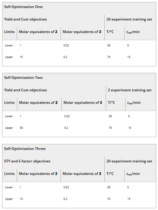 Table 1. Continuous variable limits for the self-optimisation of the aldol condensation reaction shown in Scheme 1. Molar equivalents is relative to the number of moles of 1. Solution concentrations: [1]=0.5 M in MeCN; [2]=6.73 M in MeCN; [3]=0.1 M in EtOH.