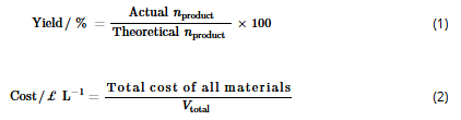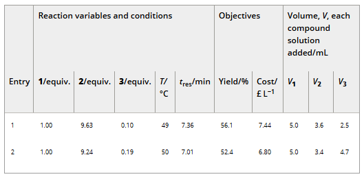 Table 2. Table of reaction variables and conditions, objective values, and volumes of each compound solution added (Vn where n=1, 2 or 3 corresponds to benzaldehyde, acetone and sodium hydroxide respectively) of two representative data points from the self-optimisation of the aldol condensation reaction shown in Scheme 1 with limits from Table 1 (Self-Optimization One), showing the difference in cost value as a result of solution volumes added.