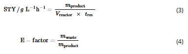 The final self-optimization performed in this study targeted reactions conditions that would maximize space-time yield (STY) and minimize the environmental impact using the E-factor metric. Space-time yield is a measure of reactor productivity related to the mass of product 4 formed (mproduct), the reactor volume (Vreactor), and tres (Eq. 3); whilst E-factor29 is defined as the ratio of the mass of waste (mwaste) to mproduct (Eq. 4.