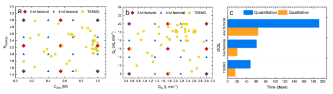 It is important to note the limitations of the specific methods used in our case study. Wet chemical synthesis and microreactors are not universally suitable for every new material. Process selection should initially be guided by practical knowledge; however, experimentalists still benefit from using efficient synthesis methods with well-defined engineering parameters early in the development. The design of experiment and/or statistical model used should also be tailored to the problem at hand. TSEMO is appropriate when multiple competing objectives exist, the variables used are continuous and experiments are expensive to evaluate. For problems in which objectives are non-competing, variables are discrete or large datasets are readily obtained, the experimental problem may be significantly different and the present methodology can be extended through the selection of another DOE approach [60].
