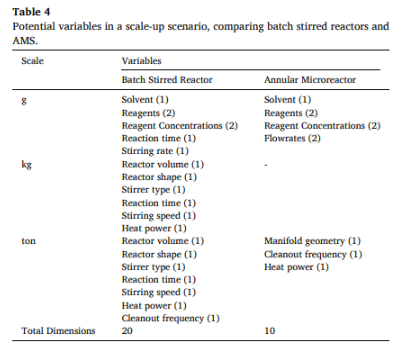 When translating stirred tank reactors to the ton day− 1 scale, the reactor geometry, agitation and maintenance (cleanout) parameters must be defined again, although the previous identification of engineering parameters from the kg day− 1 scale reduces the difficulty [76–79]. On the other hand, AMS scales to ton day− 1 by simply multiplying the number of reactors, which can be achieved using proper manifolding techniques (for which established design rules are known) and machining tolerances [20,80]. This allows precise conservation of engineering parameters from the g and kg day− 1 scale, and only requires the design of temperature control and optimization of a maintenance schedule. In total, for the hypothetical scale-up scenario, scaling AMS involves 10 dimensions compared to 20 for stirred tank reactors, halving the complexity. AMS may also be scaled via increase of tubing diameter, scaling the flowrates and tubing length to conserve shear rates, micromixing times and residence times. Targeting the correct flowrates and tube dimensions for parameter conservation may be done by hydrodynamic modelling or experimentally.